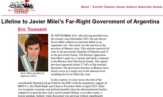 “En las elecciones de octubre de 2023, Milei ganó las elecciones presidenciales presentándose como un salvador y utilizando métodos de comunicación similares a los de Trump. Recibió inmediatamente las felicitaciones del FMI. Las grandes empresas argentinas e internacionales se mostraron complacidas. Pero las medidas de choque que adoptó provocaron una caída del consumo y un aumento de la pobreza, y no lograron reactivar la economía. Las ya escasas reservas de divisas se redujeron aún más. Milei esperaba que su impopular política de austeridad y sus múltiples medidas de desregulación atrajeran una gran afluencia de capital extranjero. Esto no ocurrió.”