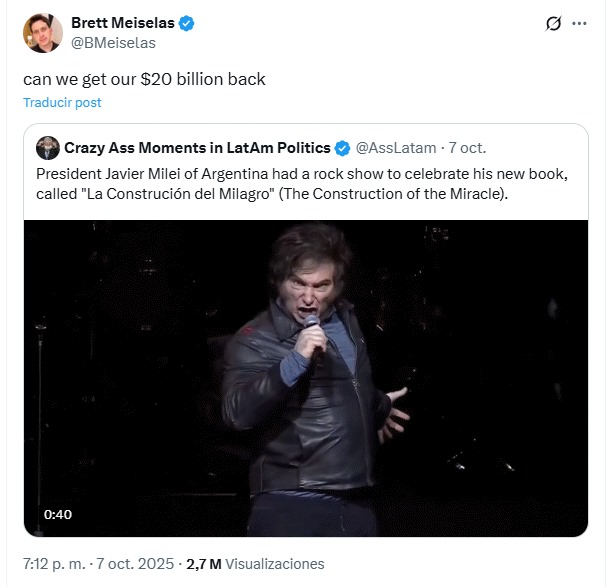 Mostrando el bochornoso video de Milei tratando de parecer un rockstar, el presentador Brett Meiselas le dijo en X a sus cinco millones de suscriptores en Youtube: “¿Podemos recuperar nuestros 20 mil millones de dólares?” (7 de octubre de 2025).