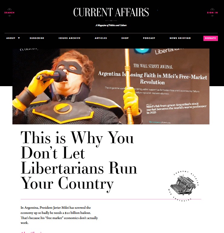 “Mientras el manual político de Milei hace eco del de Trump, con su abrazo del caos y la farándula, sus políticas económicas tributan de otra radical de pelo extraño: Margaret Thatcher (…) Hay aspectos de su enfoque, incluyendo el ataque sistemático a derechos sindicales, cortes de fondos públicos y ola de privatizaciones, que tienen ecos de Thatcherismo”.