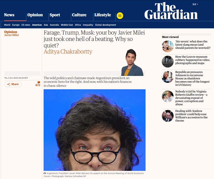 “Trump se adentra en la política de rescates financieros al ofrecer un salvavidas a Argentina. […] El control del populista asediado se debilita a medida que la ayuda estadounidense expone su vulnerabilidad a la extorsión, en un intento desesperado por salvar su régimen en ruinas.”