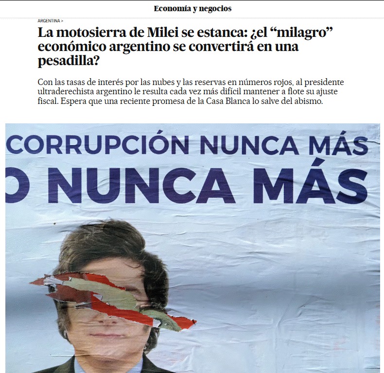 “La administración Trump está subiendo la apuesta en su apuesta sin precedentes por el presidente argentino Javier Milei. […] Pero hay un problema: las políticas drásticas del ultraliberal están destrozando la economía, convirtiendo a un aliado potencial en un lastre para los intereses estadounidenses.”