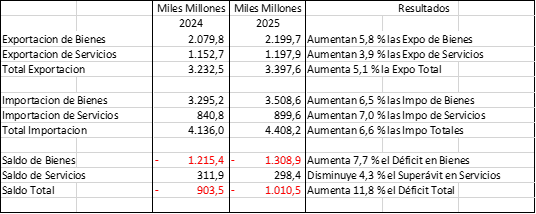 En 2025 aumentaron 5,1% las exportaciones de Bienes y Servicios, pero las importaciones totales aumentaron 6,6%, lo cual profundizó el déficit comercial en 11,8% al superar el billón de dólares (trillion en inglés) frente a los 0,9 billones de 2024.